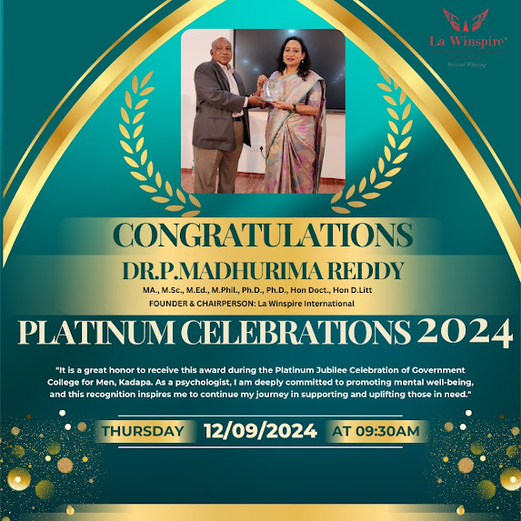 Dr.Β PΒ MadhurimaΒ Reddy, renowned psychologist,Β counsellor, andΒ CEO &Β Founder ofΒ LaΒ WinspireΒ International, has beenΒ honouredΒ with several prestigious awards for her dedication to mental health,Β counselling, coaching, and personal development. Her commitment to transforming lives and empowering individuals has earned her recognition at national and international levels.Β